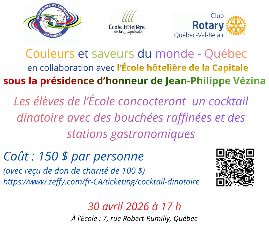 Participez à notre cocktail dinatoire sur les 21 régions du Québec "Couleurs et saveurs du monde - Québec" en date du 30 avril 2026. Voici un lien pour acheter des billets :